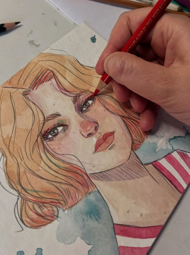Sus obras, realizadas principalmente en acuarela, transmiten sensibilidad, fantasía y una conexión profunda con lo femenino. Cada trazo suyo parece contar una historia silenciosa que invita a soñar.